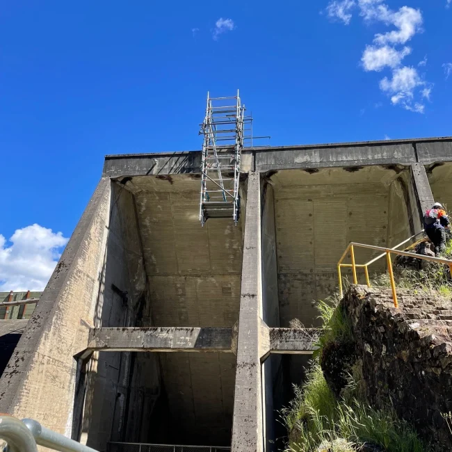 Custom scaffolds for safe access during hydropower facility upgrade, supporting green energy initiatives.
